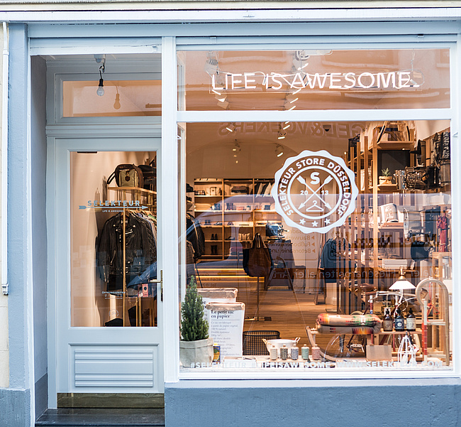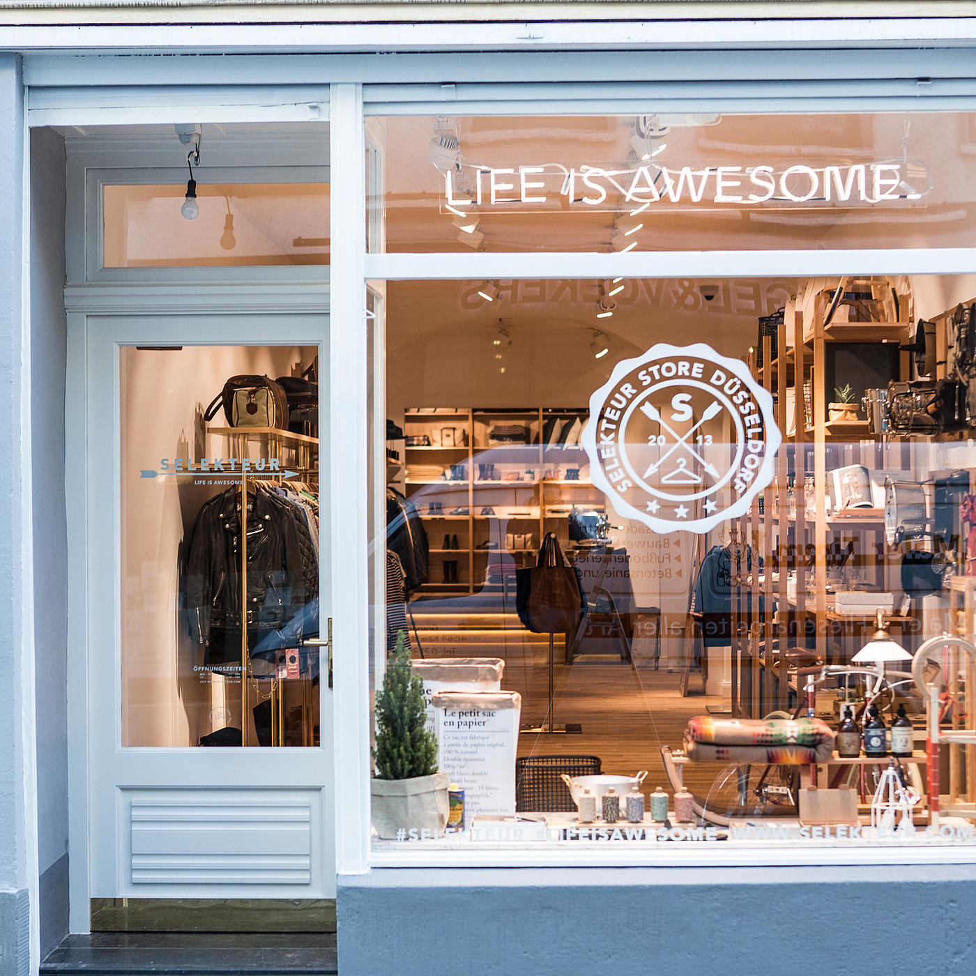 Haushaltswaren, Wohnaccessoires, Papeterie, Kinderspielzeug, Kinderkleidung, Schmuck, Biokosmetik, Bekleidung. Aus all diesen Bereichen bietet der SELEKTEUR zeitlose Klassiker von europäischen Manufakturen. Er passt perfekt in die charmante Atmosphäre der historischen Carlstadt und verkündet mit Leuchtlettern im Fenster die frohe Botschaft: LIFE IS AWESOME. Die Gestaltung des Concept Stores mit massivem Kirschholz und Messing unterstreicht die Handschrift des Ladens – hochwertig, schlicht, unaufgeregt.