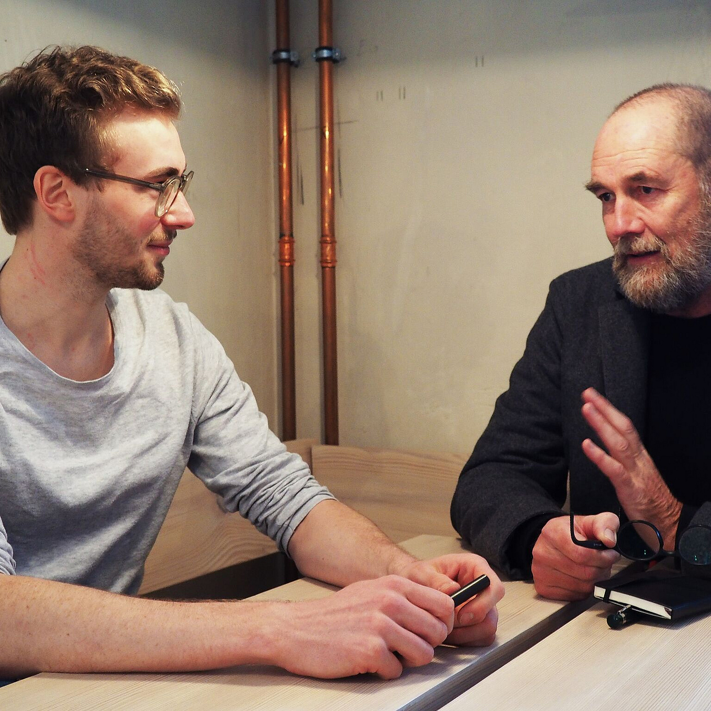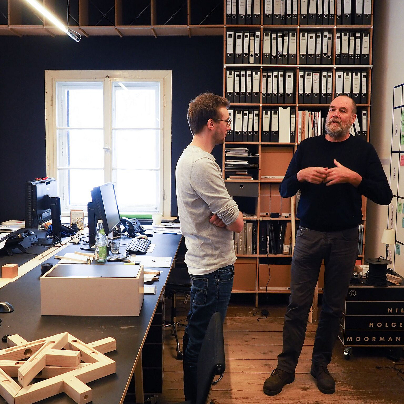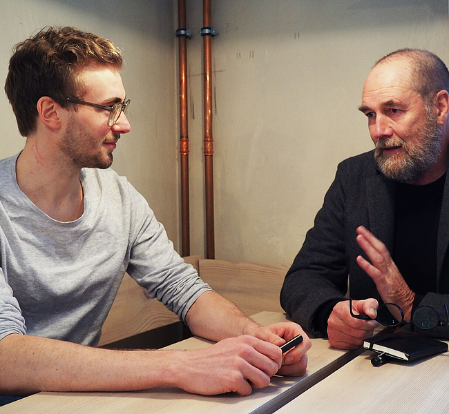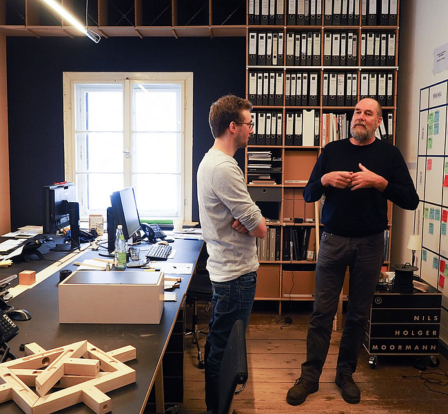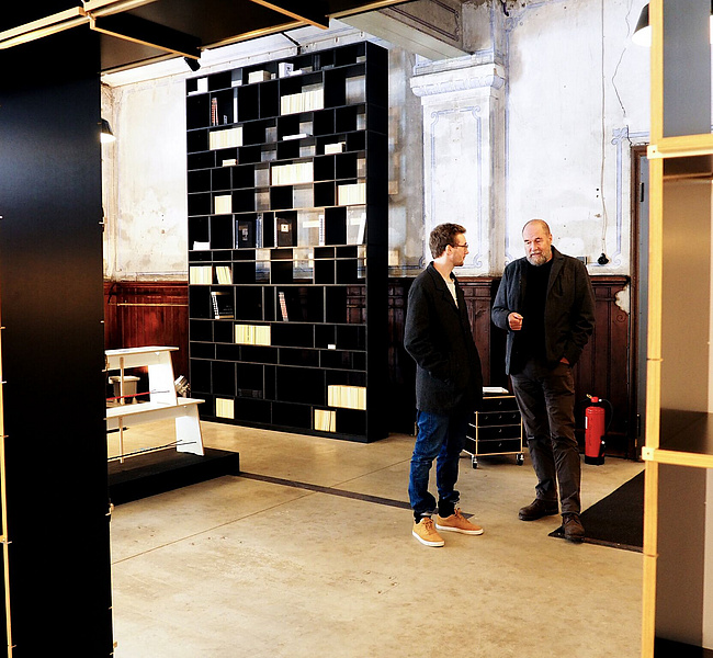 Zwischen Konventionen nimmt Nils Holger Moormann am liebsten Platz und macht es sich mit seinen Möbeln bequem, die alle ein bisschen so sind wie er selbst – asketisch, durchdacht, mit einem kleinen, fast unmerklichen Augenzwinkern. Als Autodidakt entwickelt er seit 1982 mit meist jungen, unbekannten Designern Möbel mit reduzierter Formensprache und präzisen Detaillösungen. Beim BLICKFANG Nachwuchswettbewerb Future Forward unterstützt er als Mentor junge Talente und nahm sich einen Tag Zeit, mit Wettbewerbs-Gewinner Kevin Gerstmeier ein persönliches Coaching durchzuführen.