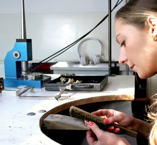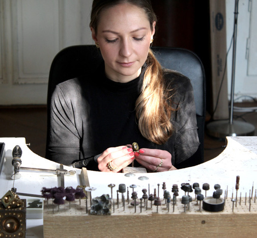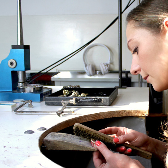 Ich arbeite mit ganz traditionellen Goldschmiede-Techniken, wie Sägen, Bohren, Fräsen, Löten, Schmieden, Gravieren und Gießen. Versuche allerdings diese klassischen Techniken immer wieder neu und innovativ zu interpretieren: Um beispielsweise durch unterschiedliche Gussmaterialien neue Oberflächenstrukturen zu schaffen oder durch 3D gedruckte Gussformen eine neue Ausgestaltung zu kreieren.