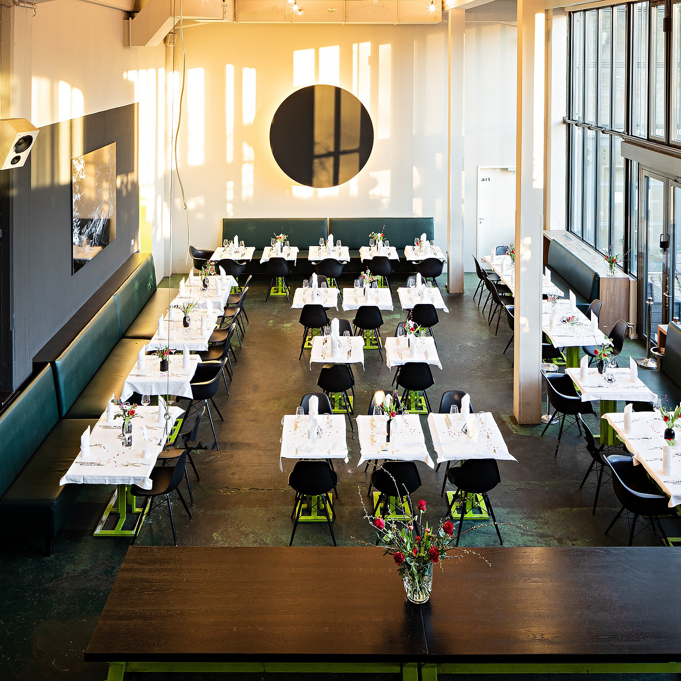 Gelegen mitten in der Kunstmeile, direkt gegenüber den Deichtorhallen, Nachbar des Hamburger Kunstvereins, ist das Pane e Tulipani dennoch nicht einfach zu erkennen. Das Pane e Tulipani sucht und findet man - und das gerne. Denn erst einmal angekommen, treten die Gäste ein in die lichten, modernen und hellen Räumlichkeiten des Restaurants. Die Gäste finden ihren Platz, eingerahmt von weißen Atelierwänden. Nur das Meer an kristallenen Kronleuchtern, hoch oben schier schwebend, brechen das Licht im Raum und verbreiten am Abend eine weiche Stimmung. Nichts soll ablenken von dem Wichtigsten: den Gästen und dem Essen, denn sie bilden die Farben und die kreative Komposition eines jeden Abends in immer wieder neuer Couleur.